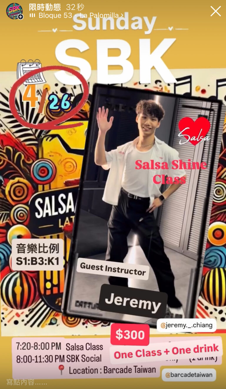 4/26 我們特別的Salsa客座師資:Jeremy, Salsa小王子, 是台灣舞圈資深但最年輕的Salsa Bachata舞者,這次將為大家帶來Salsa Shine 單人律動教學‼️ 想讓你的Salsa跳起來跟小王子一樣帥嗎? 一起來體驗吧!!